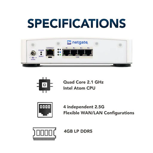 CPU: Intel Atom C1110 with AVX2, 4-core @ 2.1 GHz. Delivers up to 3x on benchmarking results for routing, firewall and IPsec VPN versus the Netgate 4100.